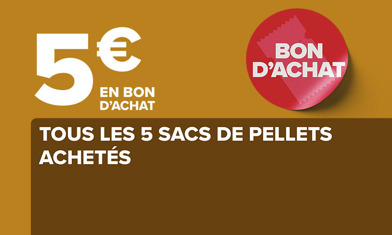 Recevez 5€ en bon d’achat tous les 5 sacs de pellets achetés (voir liste des sacs de pellets éligibles ci-dessous) disponibles dans l’un de nos supermarchés Carrefour Market et Market (hors Drive et hors Marketplace) situés en France métropolitaine, Corse comprise et participants à l’opération.