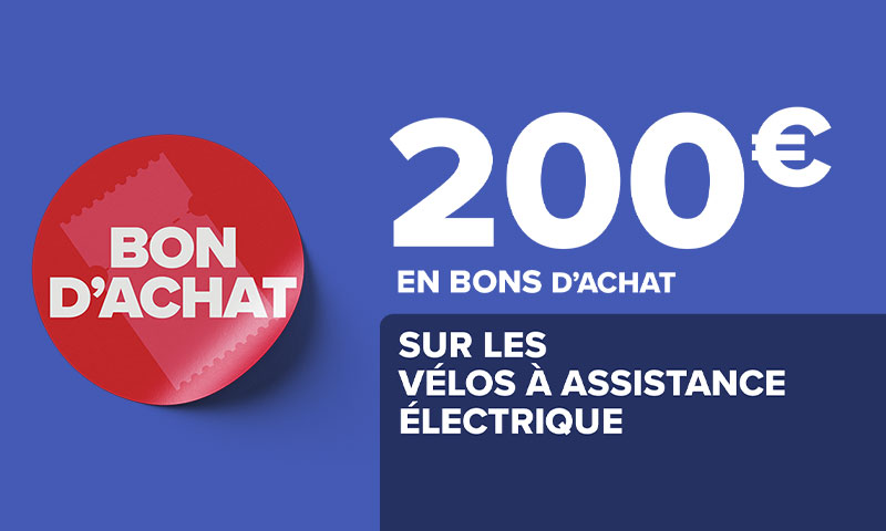 Carrefour Market vous offre 200€ en 4 bons d’achat de 50€ pour tout achat d’un vélo à assistance électrique (hors draisiennes, trottinettes, vélos de ville & VTT) disponible dans l’un de nos supermarchés Carrefour Market et Market (Drive compris, hors Marketplace) situés en France métropolitaine, Corse comprise et participants à l’opération.