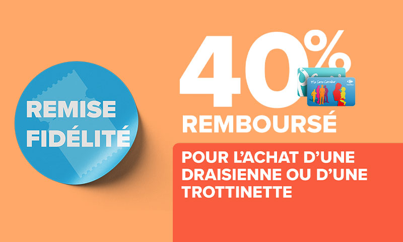 Bénéficiez de 40% REMBOURSÉS SUR VOTRE COMPTE FIDÉLITÉ pour l’achat d’une DRAISIENNE ou d’une TROTTINETTE dans l’un de nos supermarchés Carrefour Market et Market (Drive compris, hors marketplace) situés en France métropolitaine, Corse comprise et participants à l’opération.