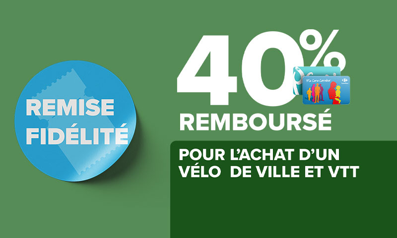 Bénéficiez de 40% remboursés sur votre compte fidélité  pour l’achat d’un VÉLO DE VILLE ET VTT, adulte et enfants (hors Vélos à Assistance Électrique, draisiennes et trottinettes) dans l’un de nos supermarchés Carrefour Market et Market (Drive Inclus, hors marketplace) situés en France métropolitaine, Corse comprise et participants à l’opération.