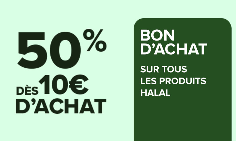 Profitez de 50% en bons d’achat dès 10 euros d’achat et dans la limite de 20 euros d’achat sur les produits halal disponibles dans nos hypermarchés à enseigne Carrefour, et Drive participants (hors Marketplace). La valeur du bon d’achat est calculée sous la forme de 2 (deux) bons d’achat de valeur égale.