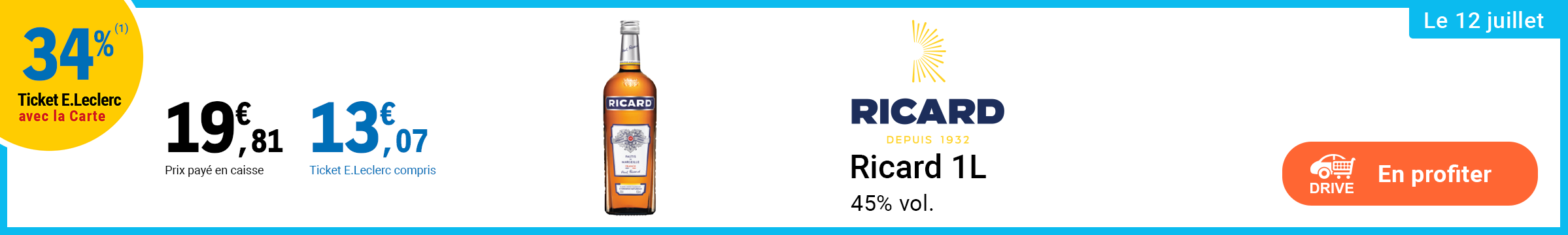 Auteur Sujet: Leclerc : 34% en tickets leclerc sur bouteille 1L Ricard 45% vol (Le 12/07)  (Lu 732 fois)