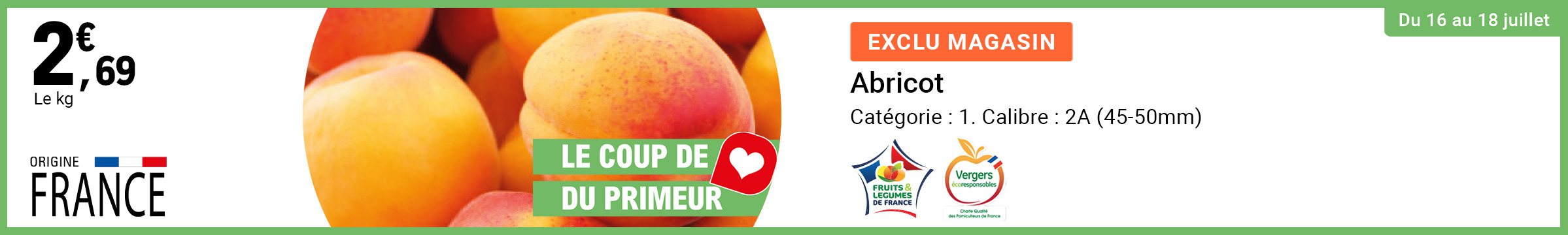 Leclerc : abricot origine France 2.69€ le kg (16/07 - 18/07)