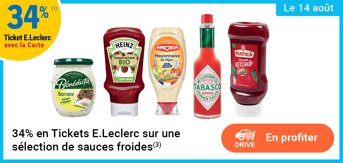 Auteur Sujet: Leclerc : 34% en tickets leclerc sur une sélection de sauces froides (Le 14/08)  (Lu 814 fois)