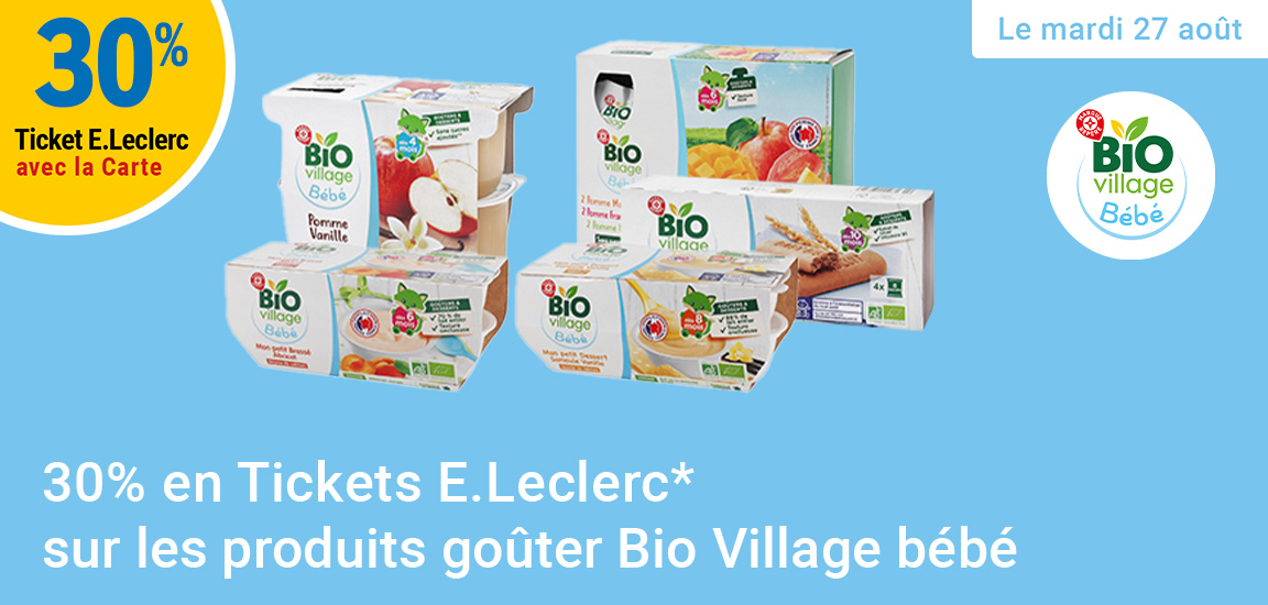 Leclerc : 30% en tickets leclerc sur produits goûter Bio Village bébé (Le 27/08)