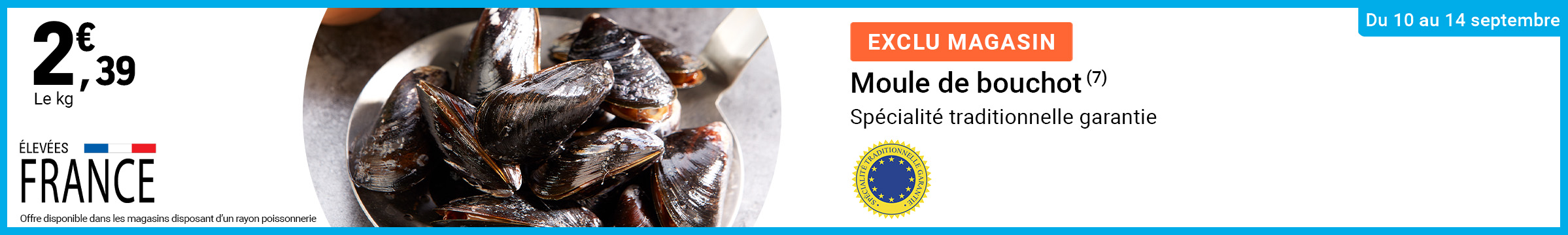 Leclerc : moule de bouchot élevées en France 2.39€ le kg (10/09 - 14/09)
