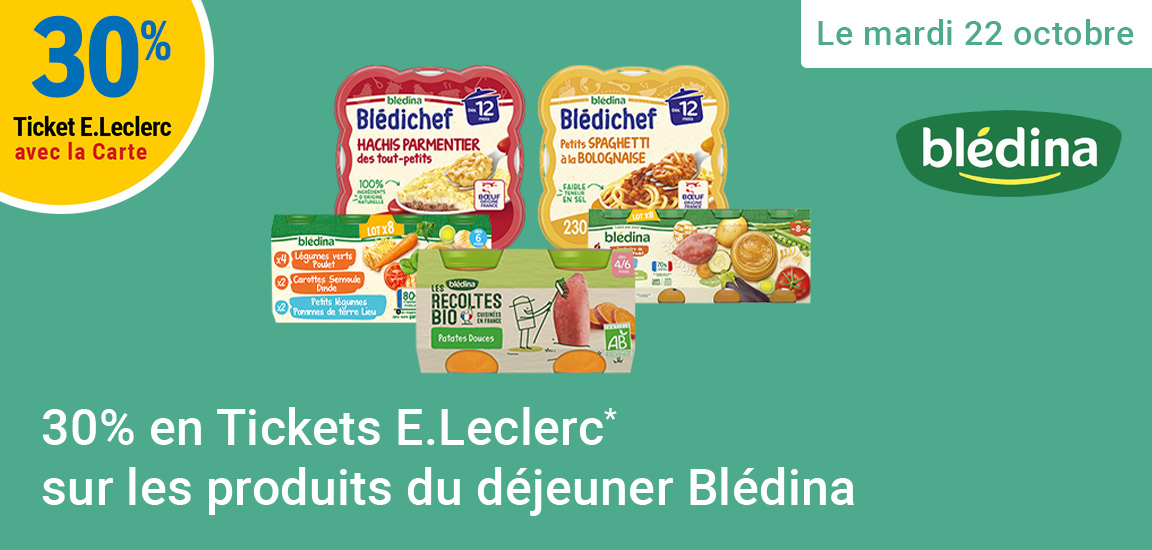 Sujet: Leclerc : 30% en tickets leclerc sur les produits du déjeuner Blédina (Le 22/10) (Lu 564 fois)
