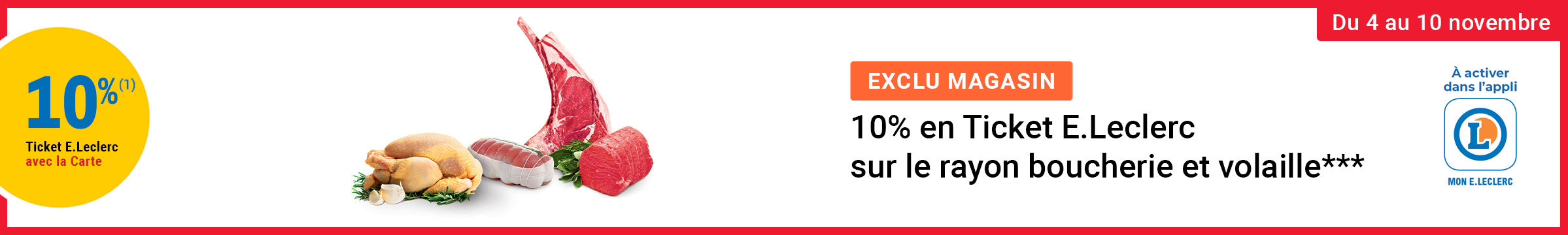 Auteur Sujet: Leclerc : 10% en tickets leclerc sur le rayon boucherie/volaille (04/11 - 10/11)  (Lu 536 fois)