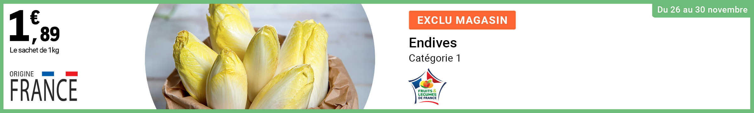 Leclerc : endives origine France 1.89€ le sachet de 1 kg (26/11 - 30/11)