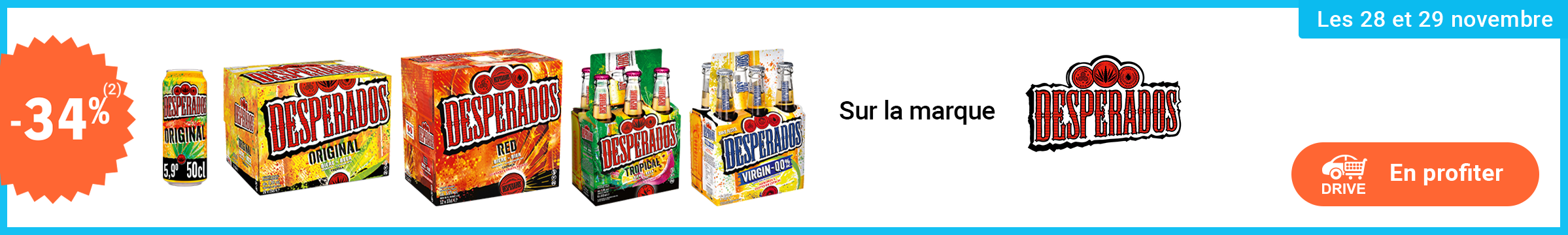(2) En magasin, avantage immédiat réservé aux porteurs de la Carte de fidélité. Offre non cumulable avec des produits de la même gamme bénéficiant d’une autre promotion. Offre limitée à 5 produits par foyer pour cette opération et réservée à une consommation personnelle. Le magasin se réserve le droit de refuser toute demande d’une quantité supérieure aux besoins habituels généralement constatés pour une consommation personnelle. Offre interdite à la revente.