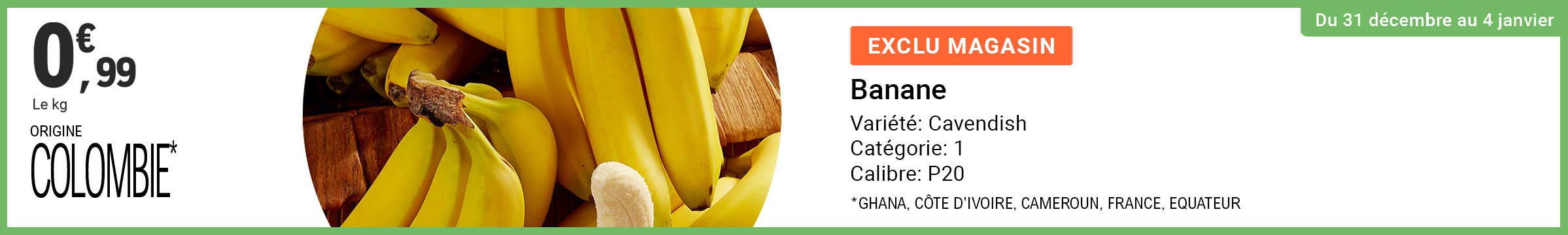 Leclerc : banane Cavendish origine différents pays 0.99€ le kg (31/12 - 04/01)