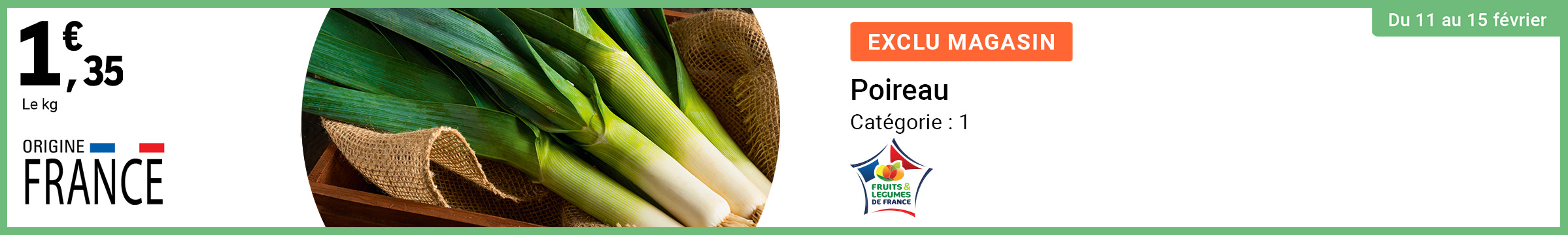 Leclerc : poireau origine France 1.35€ le kg (11/02 - 15/02)