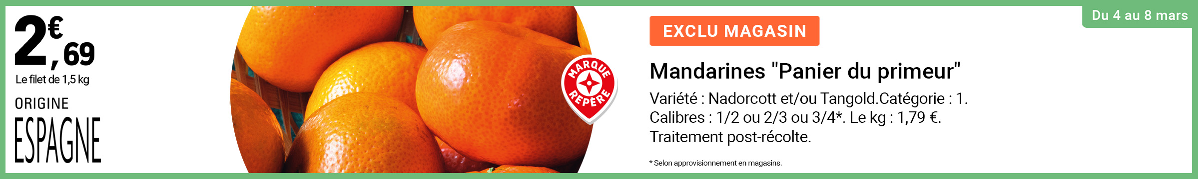 Leclerc : madarines "panier du primeur" origine Espagne 2.69€ les 1.5kg (4/3-8/3