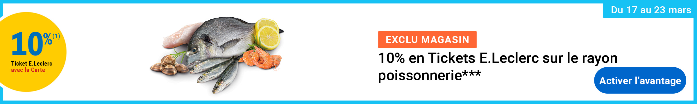 Auteur Sujet: Leclerc : 10% en tickets leclerc sur le rayon poissonnerie (17/03 - 23/03)  (Lu 530 fois)