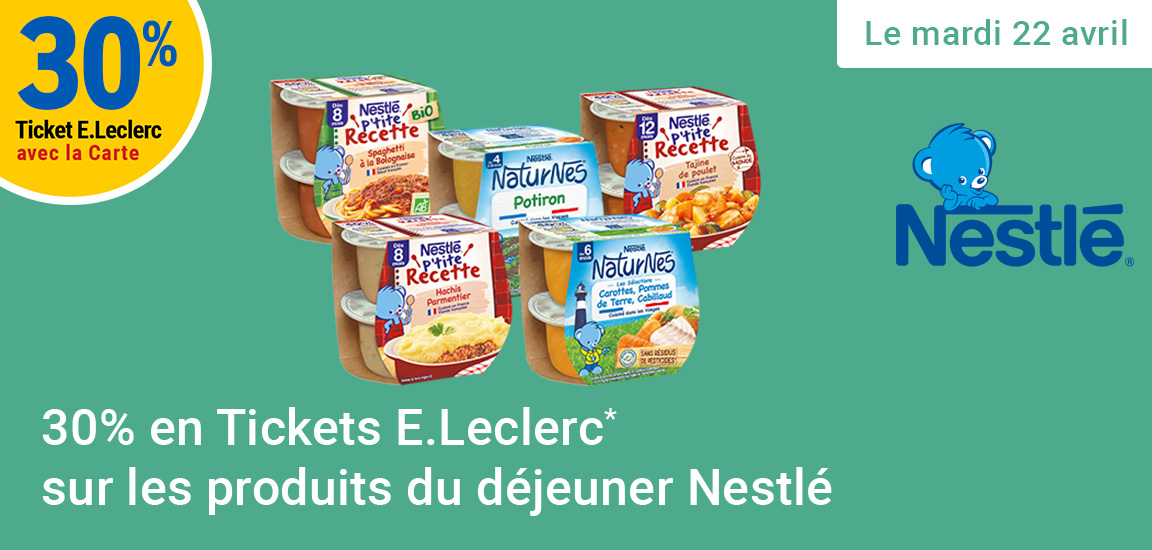 Sujet: Leclerc : 30% en tickets leclerc sur les produits du déjeuner Nestlé (Le 22/04) (Lu 421 fois)