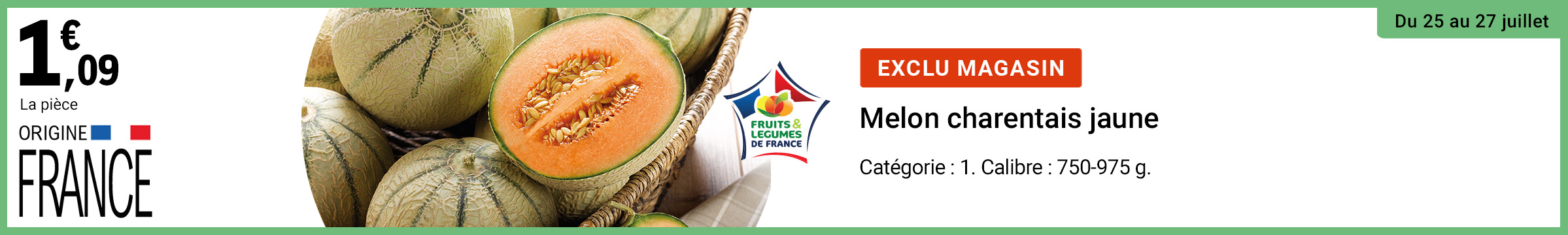 Leclerc : melon charentais jaune origine France 1.09€ la pièce (25/07 - 27/07)