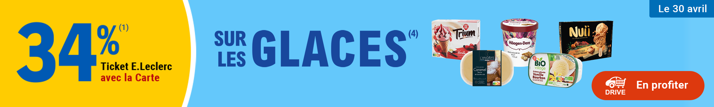 (1) Offre en Ticket E.Leclerc non cumulable avec des produits de la même gamme bénéficiant d’un autre « Ticket E.Leclerc » ou d’une autre promotion. Bon d’achat réservé aux porteurs de la Carte E.Leclerc, sur présentation en caisse de la Carte E.Leclerc et valable dès le lendemain de son obtention, cumulable sur la Carte E.Leclerc et utilisable sur tous les produits de l’ensemble des centres E.Leclerc participant au programme de fidélité. Offre limitée à 15 produits par foyer par opération et non cumulable avec des produits de la même gamme bénéficiant d’un autre « Ticket E.Leclerc » ou d’une autre promotion. Carte E.Leclerc 100 % gratuite et disponible immédiatement. Offre réservée à une consommation personnelle. Le magasin se réserve le droit de refuser toute demande d’une quantité supérieure aux besoins habituels généralement constatés pour une consommation personnelle. Offre interdite à la revente. Offre non cumulable avec des produits de la même gamme bénéficiant d’une autre promotion et non valable sur les produits signalés en magasin.