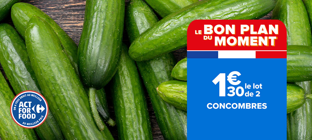 Auteur Sujet: Carrefour et Market : Concombre 1,30€ les 2 Origine France (30/09 - 02/10)  (Lu 183 fois)