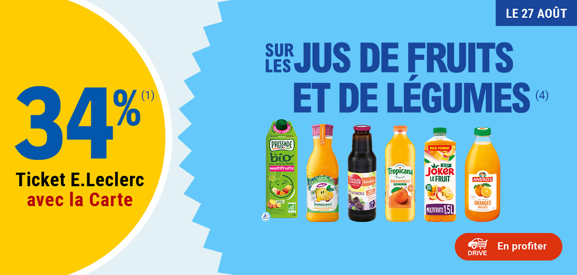 (1) Offre en Ticket E.Leclerc non cumulable avec des produits de la même gamme bénéficiant d’un autre « Ticket E.Leclerc » ou d’une autre promotion. Bon d’achat réservé aux porteurs de la Carte E.Leclerc, sur présentation en caisse de la Carte E.Leclerc et valable dès le lendemain de son obtention, cumulable sur la Carte E.Leclerc et utilisable sur tous les produits de l’ensemble des centres E.Leclerc participant au programme de fidélité. Offre limitée à 15 produits par foyer par opération et non cumulable avec des produits de la même gamme bénéficiant d’un autre « Ticket E.Leclerc » ou d’une autre promotion. Carte E.Leclerc 100 % gratuite et disponible immédiatement. Offre réservée à une consommation personnelle. Le magasin se réserve le droit de refuser toute demande d’une quantité supérieure aux besoins habituels généralement constatés pour une consommation personnelle. Offre interdite à la revente. Offre non cumulable avec des produits de la même gamme bénéficiant d’une autre promotion et non valable sur les produits signalés en magasin.