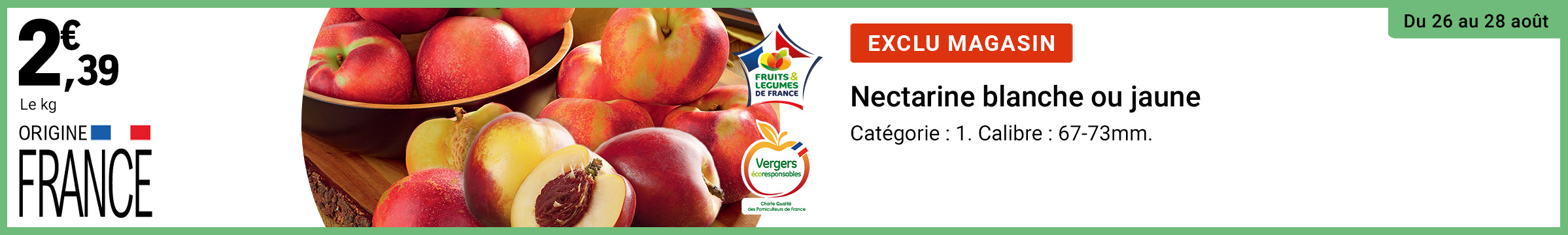 Leclerc : nectarine blanche/jaune origine France 2.39€ le kg (26/08 - 28/08)
