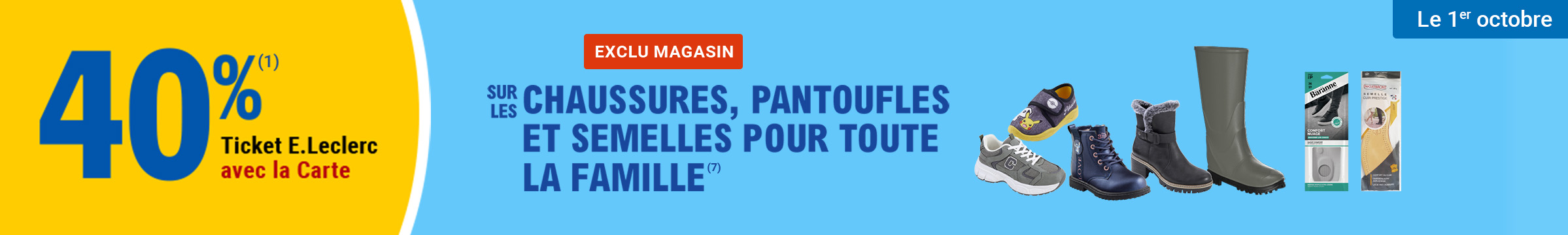(1) Offre en Ticket E.Leclerc non cumulable avec des produits de la même gamme bénéficiant d’un autre « Ticket E.Leclerc » ou d’une autre promotion. Bon d’achat réservé aux porteurs de la Carte E.Leclerc, sur présentation en caisse de la Carte E.Leclerc et valable dès le lendemain de son obtention, cumulable sur la Carte E.Leclerc et utilisable sur tous les produits de l’ensemble des centres E.Leclerc participant au programme de fidélité. Offre limitée à 15 produits par foyer par opération et non cumulable avec des produits de la même gamme bénéficiant d’un autre « Ticket E.Leclerc » ou d’une autre promotion. Carte E.Leclerc 100 % gratuite et disponible immédiatement. Offre réservée à une consommation personnelle. Le magasin se réserve le droit de refuser toute demande d’une quantité supérieure aux besoins habituels généralement constatés pour une consommation personnelle. Offre interdite à la revente. Offre non cumulable avec des produits de la même gamme bénéficiant d’une autre promotion et non valable sur les produits signalés en magasin.