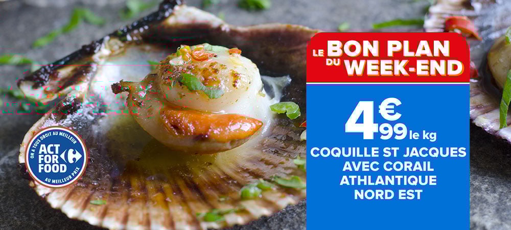 Carrefour et Market : Coquille St Jacques avec corail 4.99€ le kg (4/10 - 5/10)