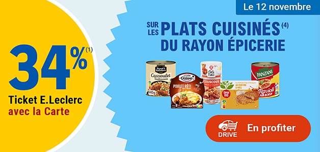 Leclerc : 34% en ticket leclerc sur les plats cuisinés rayon épicerie (Le 12/11)