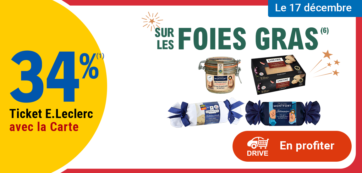 (6) Hors foies gras crus du rayon boucherie/volaille et foies gras surgelés. Non valable sur les corbeilles et compositions, les terrines et le pâté au foie gras, les produits Eco+. Hors produits Marque Repère (Pierre de Chaumeyrac, L’origine du goût & Nos régions ont du talent).