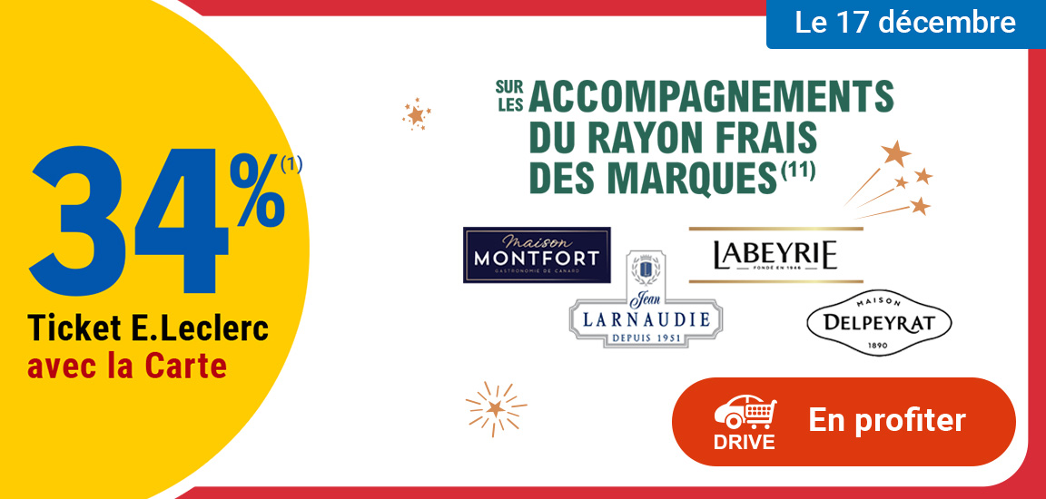 (1) Offre en Ticket E.Leclerc non cumulable avec des produits de la même gamme bénéficiant d’un autre « Ticket E.Leclerc » ou d’une autre promotion. Bon d’achat réservé aux porteurs de la Carte E.Leclerc, sur présentation en caisse de la Carte E.Leclerc et valable dès le lendemain de son obtention, cumulable sur la Carte E.Leclerc et utilisable sur tous les produits de l’ensemble des centres E.Leclerc participant au programme de fidélité. Offre limitée à 15 produits par foyer par opération et non cumulable avec des produits de la même gamme bénéficiant d’un autre « Ticket E.Leclerc » ou d’une autre promotion. Carte E.Leclerc 100 % gratuite et disponible immédiatement. Offre réservée à une consommation personnelle. Le magasin se réserve le droit de refuser toute demande d’une quantité supérieure aux besoins habituels généralement constatés pour une consommation personnelle. Offre interdite à la revente. Offre non cumulable avec des produits de la même gamme bénéficiant d’une autre promotion et non valable sur les produits signalés en magasin.