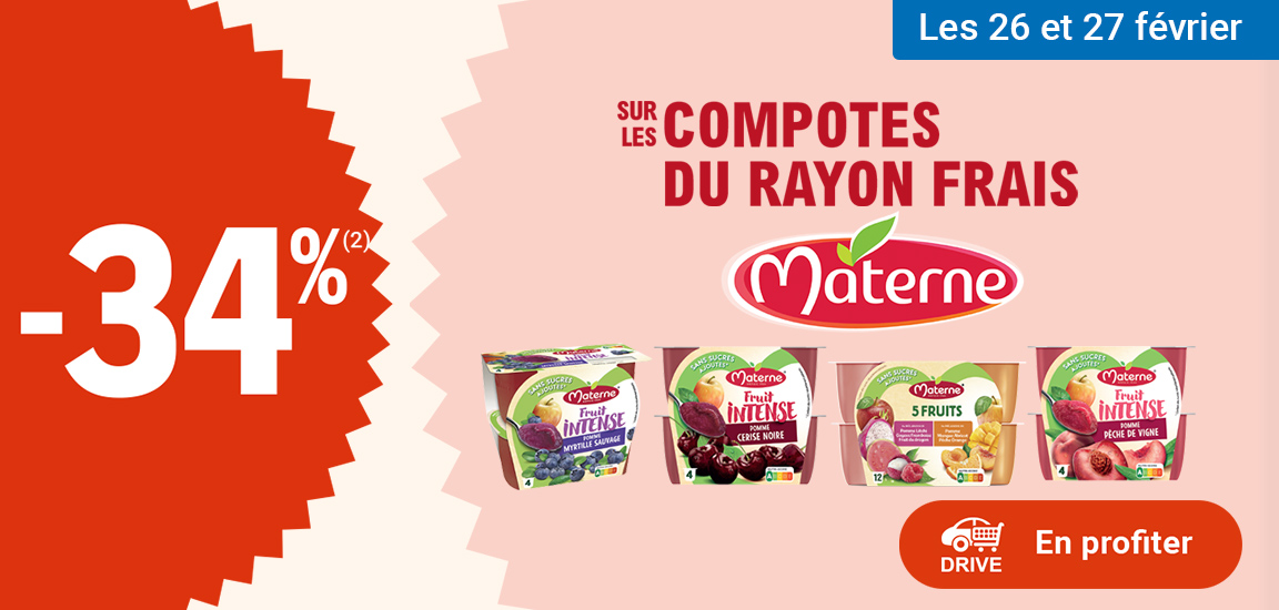 Auteur Sujet: Leclerc : 34% de RI sur compotes du rayon frais Materne (26/02 - 27/02)  (Lu 20 fois)