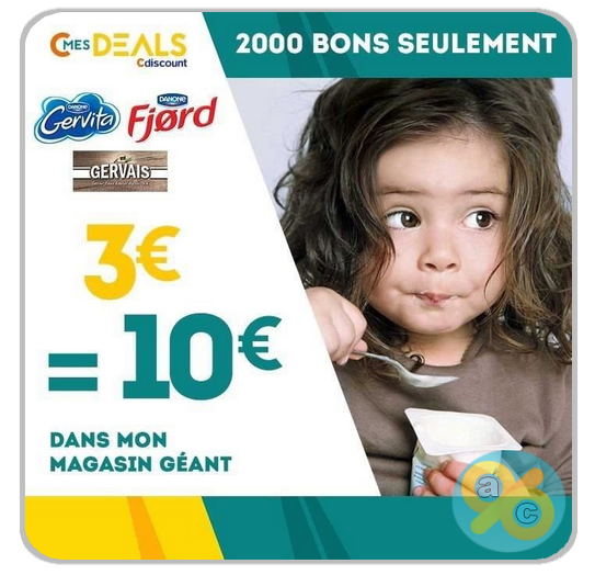Sur Cdiscount, vous pouvez achetez un bon d'achat que vous paierez 3 euros et qui aura une valeur de 10 euros à géant sur les gammes Gervais, Gervita et Fjord.