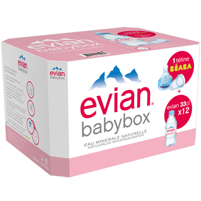 Un pack Babybox : 12 bouteilles d’evian 33cL + 1 tétine (dès 6 mois)