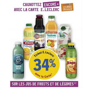 Leclerc : 34% en Tickets E.Leclerc sur les jus de fruits et de légumes (31/08)