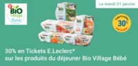 Leclerc : 30% en tickets leclerc produits déjeuner Bio Village Bébé (Le 31/01)