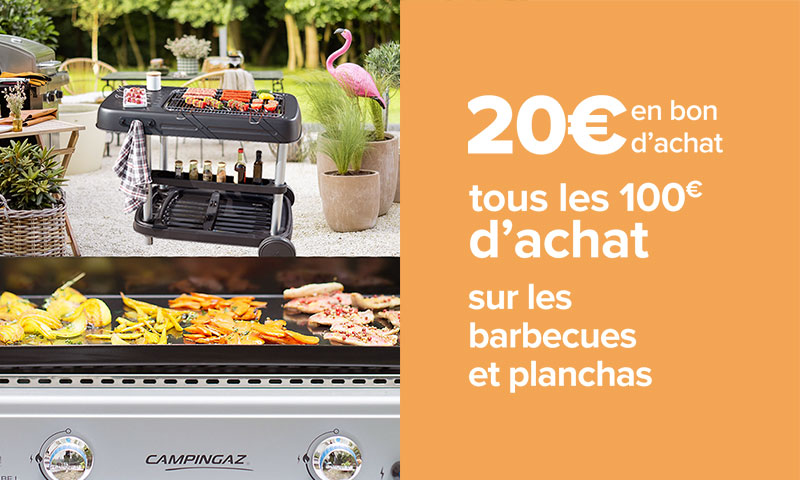 Profitez de 20 euros en bon d’achat par tranche de 100 euros d’achat sur tous les barbecues et planchas disponibles dans l’un de nos hypermarchés à enseigne Carrefour, Drive et livraison à domicile compris (hors livraison express et marketplace), situés en France métropolitaine, Corse comprise, et participants à l’opération.