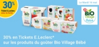 Leclerc : 30% en tickets leclerc sur produits goûter Bio Village Bébé (Le 16/05)