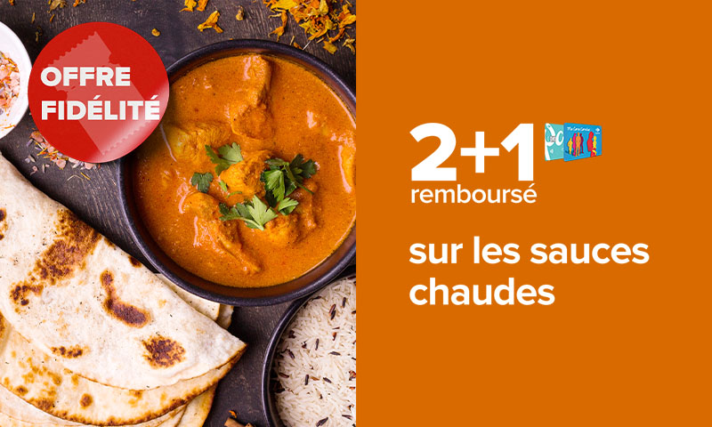 Pour 3 sauces chaudes achetées (hors promotions), dans les Drive Hypermarchés et en Livraison à domicile, situés en France métropolitaine, Corse comprise, et participants à l’opération, le moins cher des 3 vous sera remboursé sur votre Carte de Fidélité Carrefour