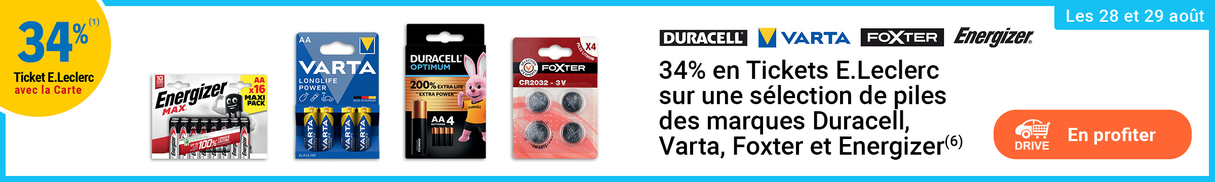 Auteur Sujet: Leclerc : 34% en tickets leclerc sur sélection marques de piles (28/08 - 29/08)  (Lu 1004 fois)
