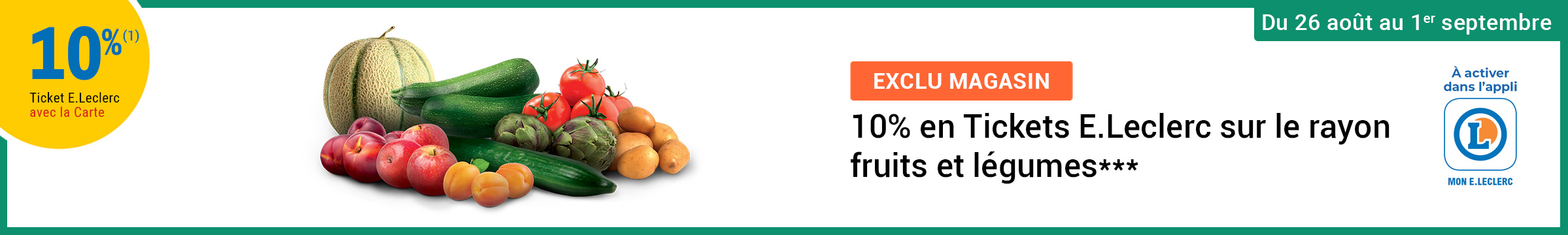 Offre à activer sur l'application Mon E.Leclerc, limitée à une utilisation par semaine, sur présentation en caisse de la Carte E.Leclerc et valable uniquement dans les Centres E.Leclerc en France, Corse comprise, hors DROM-COM. Offre non valable en Drive E.Leclerc et E.Leclerc Chez Moi. Sous réserve que votre magasin participe aux avantages de cette opération.