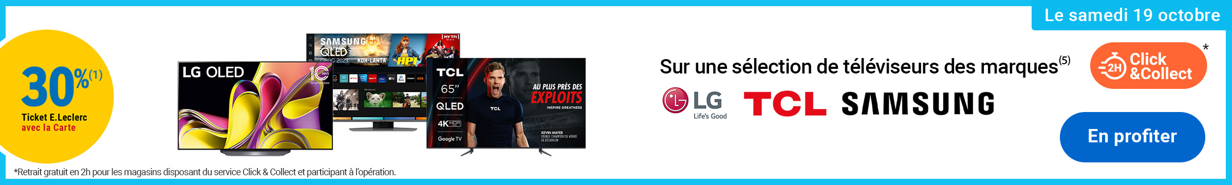 (1) Offre en Ticket E.Leclerc non cumulable avec des produits de la même gamme bénéficiant d’un autre « Ticket E.Leclerc » ou d’une autre promotion. Bon d’achat réservé aux porteurs de la Carte E.Leclerc, sur présentation en caisse de la Carte E.Leclerc et valable dès le lendemain de son obtention, cumulable sur la Carte E.Leclerc et utilisable sur tous les produits de l’ensemble des centres E.Leclerc participant au programme de fidélité. Offre limitée à 15 produits par foyer par opération et non cumulable avec des produits de la même gamme bénéficiant d’un autre « Ticket E.Leclerc » ou d’une autre promotion. Carte E.Leclerc 100 % gratuite et disponible immédiatement. Offre réservée à une consommation personnelle. Le magasin se réserve le droit de refuser toute demande d’une quantité supérieure aux besoins habituels généralement constatés pour une consommation personnelle. Offre interdite à la revente. Offre non cumulable avec des produits de la même gamme bénéficiant d’une autre promotion et non valable sur les produits signalés en magasin.