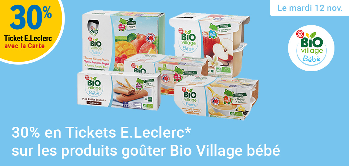 Leclerc : 30% en tickets leclerc sur produits goûter Bio Village bébé (Le 12/11)