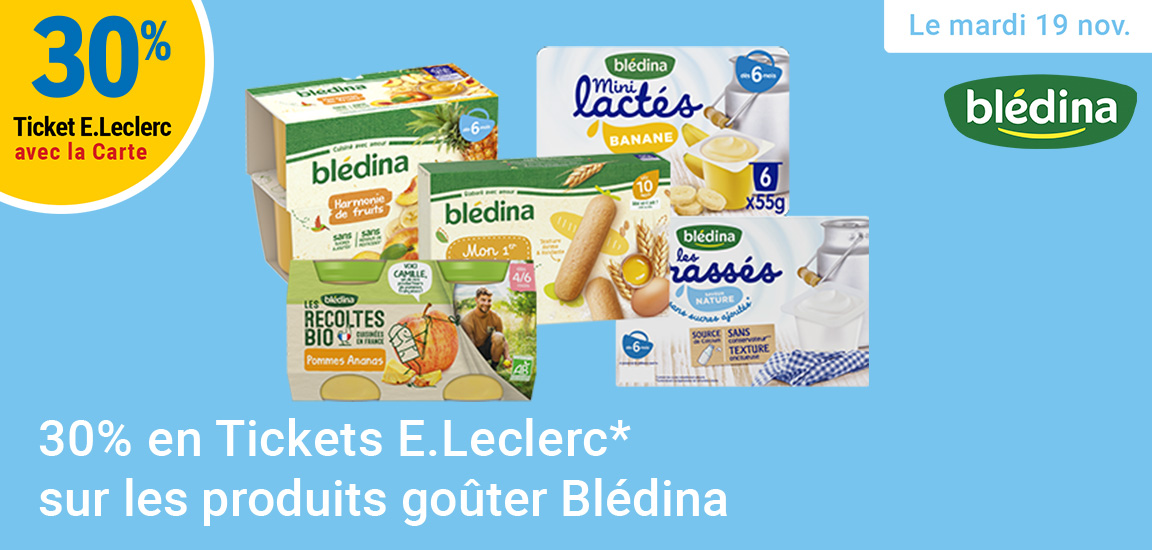 Leclerc : 30% en tickets leclerc sur les produits goûter Blédina (Le 19/11)