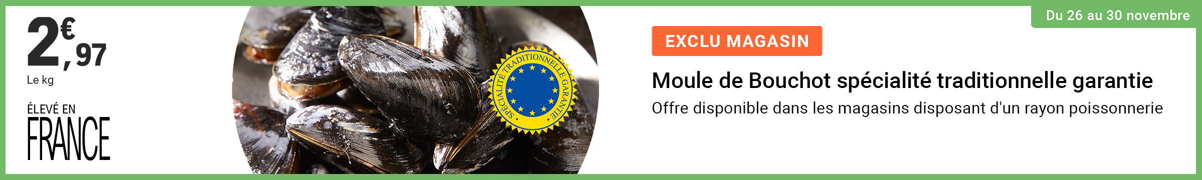 Leclerc : moule de bouchot origine France 2.97€ le kg (26/11 - 30/11))