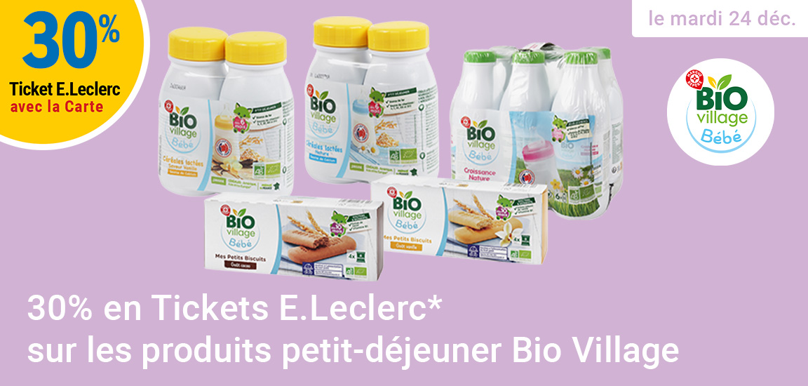 Leclerc : 30% en tickets leclerc produits petit-déjeuner Bio Village (Le 24/12)