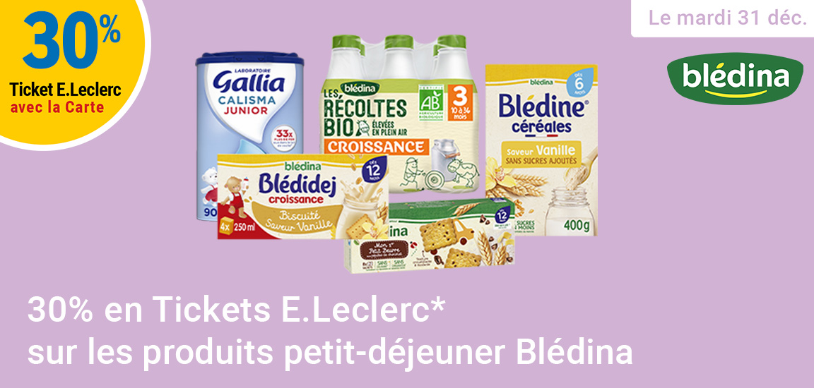 Leclerc : 30% en tickets leclerc sur produits petit-déjeuner Blédina (Le 31/12)