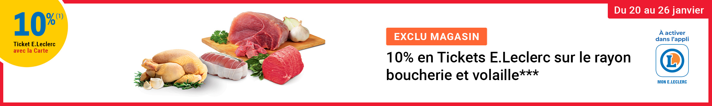 Offre à activer sur l'application Mon E.Leclerc, limitée à une utilisation par semaine, sur présentation en caisse de la Carte E.Leclerc et valable uniquement dans les Centres E.Leclerc en France, Corse comprise, hors DROM-COM. Offre non valable en Drive E.Leclerc et E.Leclerc Chez Moi.
