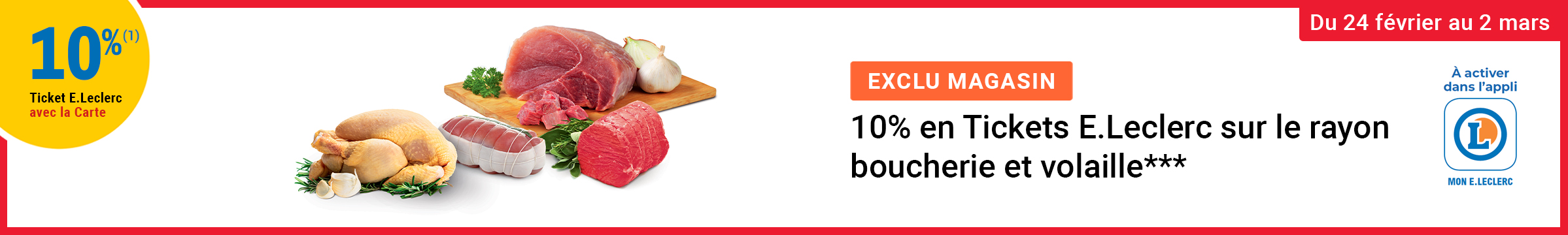 Auteur Sujet: Leclerc : 10% en tickets leclerc sur rayon boucherie et volaille (24/02 - 02/03)  (Lu 564 fois)