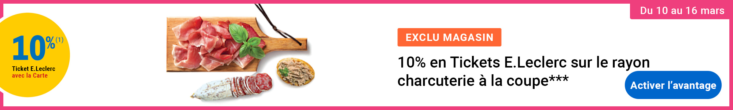 Leclerc : 10% en tickets leclerc sur rayon charcuterie à la coupe (10/3 - 16/3)