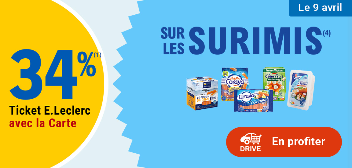Auteur Sujet: Leclerc : 34% en tickets leclerc sur les surimis (Le 09/04)  (Lu 563 fois)