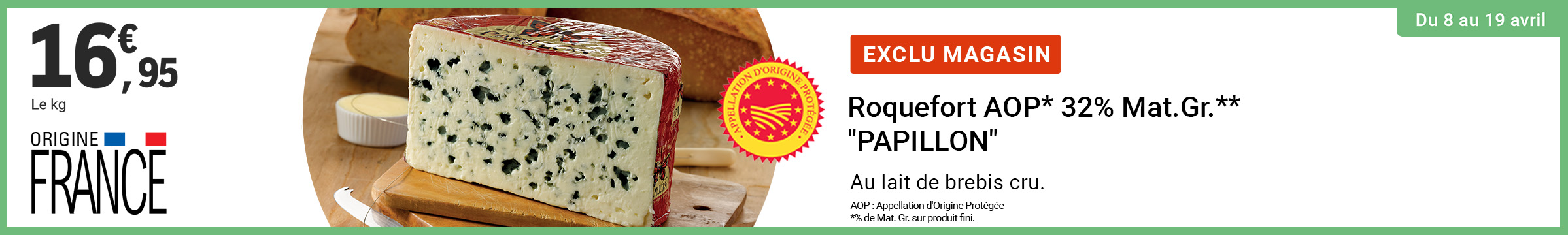 Leclerc : roquefort AOP "Papillon" origine France 16.95€ le kg (08/04 - 19/04)